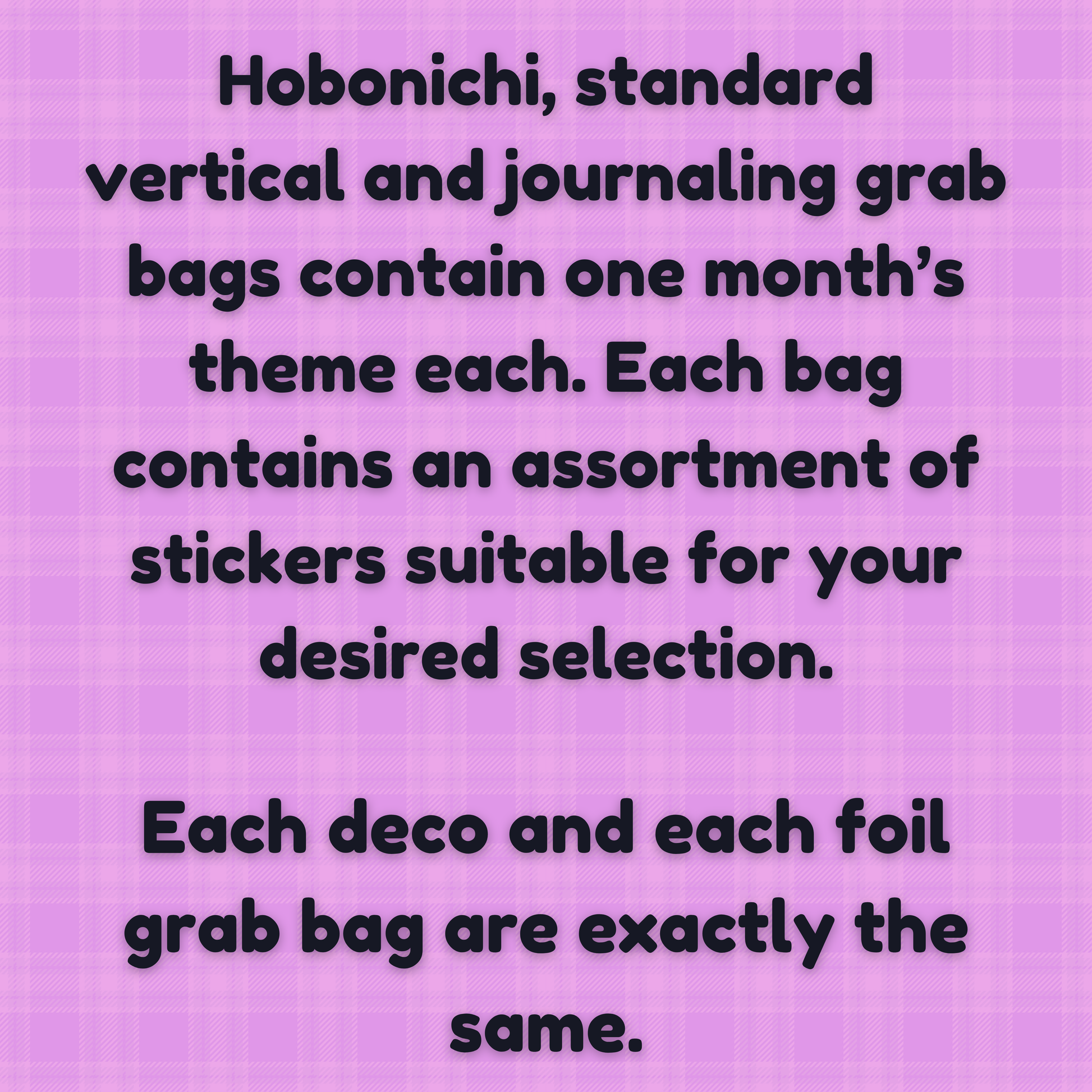 ♥ Hobonichi cousin, standard vertical and journaling grab bags contain one month's theme each. Each bag contains an assortment of stickers suitable for your desired selection.